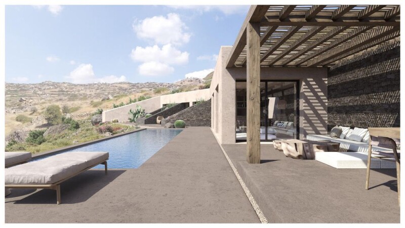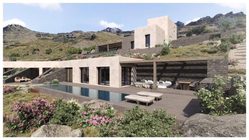 The villas are designed by a very well known team of architects and will be built on a hill, offering an unobstructed view of the sea and the neighbouring island of Paros. The first villa - the highest one - has an area of 144 square meters. and is spread over two floors. On the ground floor there are two bedrooms, two bathrooms, the kitchen and the living room, while on the first floor there is a large bedroom and a bathroom. The second villa has an area of 157 square meters and is a whole ground floor house. It consists of three bedrooms, three bathrooms, a kitchen and a living room. It will completely hidden under a green roof from the first villa. For the exterior and interior of the houses, earthy brown tones have been chosen which harmoniously combine with the natural environment of the area. The outdoor areas around each house are designed with comfortable seating areas, a pergola, and a large swimming pool. The distance from Plaka beach is 800 m. and 5 km from the city of Naxos. The first house is 144 sq.m on a plot of 2.000 sq.m. Price: 920.000 euros The second house is 157 sq.m. on a plot of 2.000 sq.m. Price: 930.000 euro.