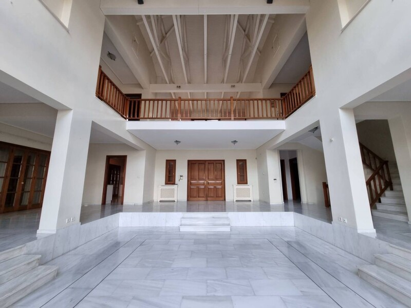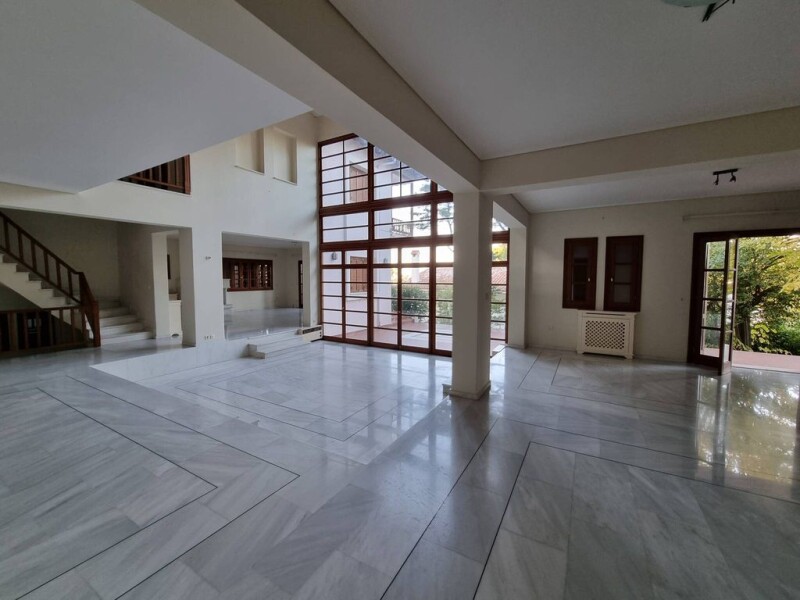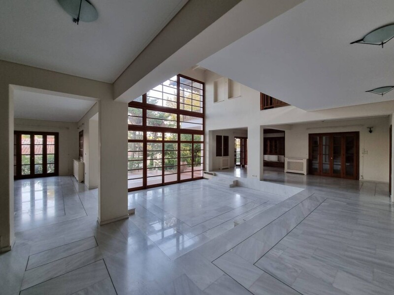 Dionysos, Detached House For Sale, 550 sq.m., On a plot of 830 sq.m., Condition: Very Good, Floor: Ground Floor, 3 Level(s), 4 Bedrooms (2 Master), 2 Kitchen(s), 5 Bathroom /a, 1 WC, impressive, huge reception areas, double height, closed office, gym with sauna and bathroom, maid's room with bathroom, laundry room, Heating: Individual - Oil, View: Green, Year of construction: 1988, Energy Certificate: Under construction, 3 parking spaces, Floors: Marble & Oak, Frames: Wooden, Features: Alarm, Storage, Fireplace (2), Internet, Electronic Devices, Playroom, Internal Staircase, Double Glazing, Verandas, Pets Allowed, Traditional house, Luxury, Mansion, Airy, Frontage, Bright, Corner, Boiler, Self-Watering, Trees, Garden, wooden frames with double glazing (in excellent condition), white Dionysos marble in the reception areas and bathrooms (flooring in the bedrooms) , imposing double-height opening in the reception area (also wooden, with double glazing), family room on the bedroom floor with a fireplace, overlooking the reception area (with an internal terrace), possibility for a swimming pool (in two different places) , ideal arrangement of spaces for separation into two residences (independent), Price: €930,000. CCRE Real Estate, Tel. Contact: 2130223537, email: info@ccre.gr.