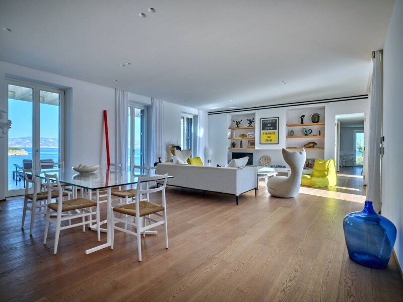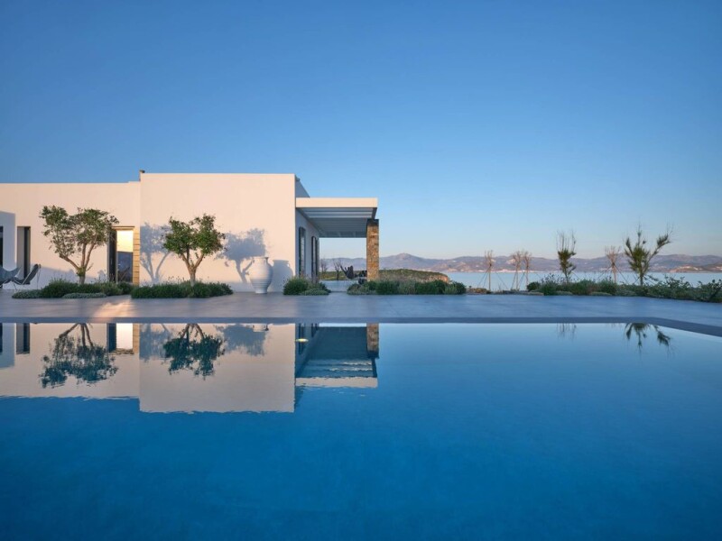 Enchanting sea vistas, mesmerising sunsets, privacy, elegance and luxurious living. Sea Melody is all that and so much more. This frontline beach villa is made up of two newly built constructions, located to the northeast of Paros, just 5km from the village of Naoussa and 25km from the airport. A wonderful fusion of both indoor and outdoor areas combine to create spaces perfect for relaxed living and spending time with friends and family. A fifteen-meter-long pool calls for endless fun in the water, under the azure clear summer skies. Exuding peaceful elegance, the outdoor spaces are perfect for relaxed living and spending time with friends and family. Built with stone to stay cool even on the hottest summer day, the shaded lounge area features a large corner sofa with comfortable cushions, perfect for a midday siesta. A large dining table is ideal for alfresco dining and enjoying delicacies prepared on the BBQ. The 280sqm pool house is complete with a kitchen, bar, living room and dining room and perfect for that extra touch of privacy. With 9 ensuite bedrooms, Sea Melody is the ideal villa for entertaining guests, offering comfortable living and a unique laid-back ambiance. The indoor living spaces are drenched with light that flows in through the large windows. Elegant white and stone hues enhance the property’s luxurious feel, blending it with the surrounding nature. Sea Melody is an extraordinary property where cherished memories are created, and life is lived to its fullest.