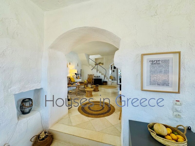 We are pleased to offer you this house for sale in the exclusive and protected area of Dilio-Krotiri, overlooking the whole of Paroikia Bay and facing the most beautiful sunsets on the island. Purchased around ten years ago by its current owners, they have constantly modified, embellished and decorated their house. Today, it's a real gem. First of all, the view is simply incredible. On a clear day, you can see practically all the islands of the Cyclades on the horizon, from Milos to Mykonos, via Sifnos, Kea, and Tinos . Every day and every hour, the view is different and enchanting. The 4,000 m2 plot, originally unusable, has become a garden planted with beautiful olive trees, and the first olive oil was produced this year. The house is also surprising: in pure Cycladic style, it has been completely renovated inside and includes a living room, a pretty kitchen, a ground-floor bedroom with en suite bathroom and, upstairs, the master bedroom with bathroom and terrace offering one of the best views on the island. But that wasn't counting on the imagination of the owners, who used an atypical room near the pool to transform it into two magnificent independent bedrooms with a beautiful bathroom. A beautiful home for those who want to enjoy the magic of the island.