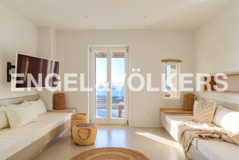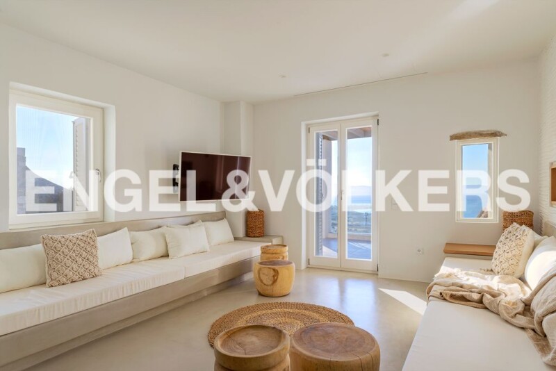 A beautifully designed hide-away villa of Cycladic minimal architecture nestled on the hillside overlooking the Golden Beach of Paros. This 4 bedroom / 6 bathroom villa is an all-inclusive paradise on earth offering the best of both worlds - privacy and comfort. The villa is built over 3 floors (ground, lower, upper) with large open spaces and specifically designed for harmonious outdoor-indoor living. The ground floor boasts an open-plan living and a dining room area with a white marble kitchen top and a double bedroom with en suite bathroom and direct access to the pool. The lower floor hosts the villa's main living quarters with 3 bedrooms with en suite bedrooms, one of which is the master double bedroom with a private veranda and direct private access to the lower garden area with immaculate sea view. On the upper floor sits 1 Mezzanine double bedroom with an extra sofa bed, access to guest WC, and a writer's desk with a sea view so incredible that it will be impossible to have a writer's block. Opening the living room doors you are immediately immersed in an idyllic Cycladic scenery with the villa 11x4m infinity pool offering a chance to get a glimpse of Greece's most iconic sunsets. The pool is surrounded by sun beds and an outdoor alfresco lounge / dining area with its own BBQ, bar, changing room and WC. An all-inclusive villa with incredible sea views, top-of-the-line interior/exterior amenities and proximity to the Dryos Town and Chrisi Akti Beach (4'-5') is what the Cycladic Paradise is about. *The Energy Certificate is under issue process! Paros seems to be the most upcoming tourist destination, voted and awarded as No1 in Europe and No2 globally, based on the publication of "Travel & Leisure" for 2019 and 2020. With continuous and growing investment interest, it attracts tourists and investors from all over the world. With the extension and improvement of the existing infrastructure of the new airport, the island will gain even better connectivity with the mainland and abroad and will be an essential transport hub in the heart of Cyclades. Direct boat infrastructure with the rest of Cycladic islands, Crete, Dodecanese, Thessaloniki and Athens is also an advantage during summertime. With an area of 186 sq.km, Paros is the 3rd largest island of Cyclades, known for its magnificent golden beaches awarded with blue flags, crystal clear blue waters, beach bars, nice restaurants and famous nightlife, attract thousands of tourists every year. Paros is an ideal destination for lovers of water sports like wind surfing, kite surfing, scuba diving with a lot of happenings taking place every year. The natural beauty, the authentic traditional architecture and the tasteful Mediterranean cuisine with fresh local products are the key for unforgettable summer holidays. Furthermore, a lot of historical places worth visiting such as "The church of Hundred Doors", Panagia Ekatontapiliani, dates to the 4th century, the Byzantine path, folklore museums and of course, the ancient marble quarry. Paros is renown for the high quality marble used for the Parthenon's roof, tiles and iconic sculptures like Nike of Samothrace , Hermes of Praxitelous and the Medici Venus. A unique destination to visit and invest!.