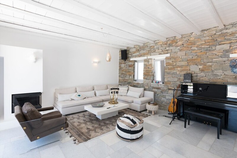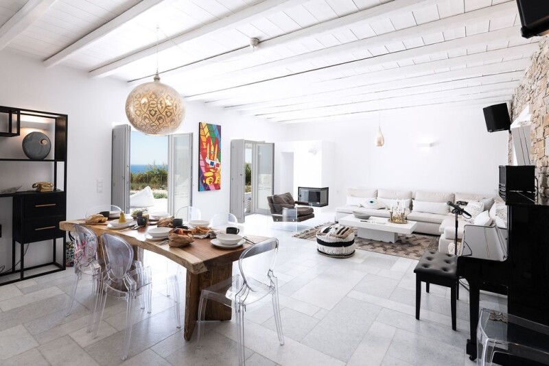 Sweeping views of emerald blue Aegean Sea waters afford this luxurious seafront villa a setting with no equal one. This stunning property is situated on the northeast coast of Paros island within walking distance of «Aspros Gremos» beach and just one kilometre away from the shore of the picturesque village of Ampelas. This astonishingly lavish dwelling stretches on 350 square metres while its plot spans on 3,500 square metres. The lodging boasts five comfortable bedrooms, four bathrooms, an open space kitchen leading to living and dining room and an ergonomic office room. It features urban chic furnishings and state-of-the-art technology equipment. The indoor layout flows effortlessly towards the terrace and the swimming pool overlooking the panoramic vistas of Naxos island opposite and the Parian breath-taking backdrop. Outdoor the residence comprises a barbeque spot, both sun-drenched pool deck and shaded verandas for relaxing, dining and gazing the magic Cycladic sunsets against the exclusive landscape of Paros. The villa’s terraces are surrounded by landscaped areas covered by white pebble interchanging with botanic gardens, full of herbs’ blossoms and scents such as lavender. This exceptional holiday lodge epitomises contemporary Mediterranean living at its finest! Ampelas is a coastal settlement on the northeast coast of Paros island. It is a picturesque, typical seaside settlement which is located just 5 km away from Naoussa, the old port of Paros. The beach of Ampelas boasts emerald blue Aegean Sea waters and it is protected by the Cycladic etesian winds, known as "meltemia". The shore is suitable for families while tourism development of the district is in progress. The region offers traditional taverns and restaurants, shops and an organised beach along with romantic beach bars. The island of Paros is an idyllic area combining golden caster shores, such as the Golden Beach (“Chryssi Akti”) with crystal-clear sea waters and marvellous mountain views. Paros is a lively island with every day amenities and bustling nightlife in cosmopolitan regions such as Naoussa yet not at the expense of security and privacy for homelovers and families. Its landscape consists of sun-drenched hillslopes and a Mediterranean surrounding nature that offers an inexhaustible terrain for outdoor enthusiasts. Paros is full of “natura areas” (environmentally protected areas with extremely restricted construction laws). In specific beachfront districts Paros offers a “hospitable domain” for those who are biding the etesian winds to blow in order to tear the Aegean seascape with their surfboard. Moreover, the vast majority of Paros coasts have been awarded the blue flag of the European Union. The average year-round temperatures of 20o Celsious is an asset for the island's visitors, tourists, e.t.c. with just a bit less than three-hour flight from central Europe to reach the island of Paros; especially after 2023 when its airport will have been expanded further.