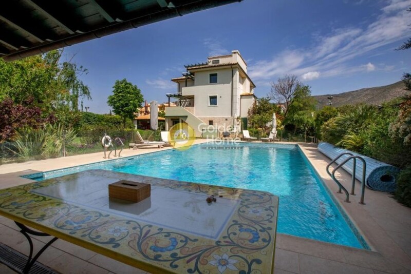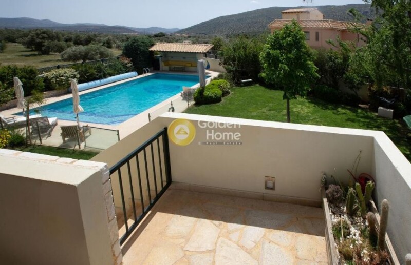 The house was built in 2006, in a 1.250 m2 plot, looking onto a large olive grove. Facing east. There are 45 square meters of exterior buildings: pool house with seating & full bathroom, underground pool house room, underground storage room, large wooden shed, seated BBQ area. The property has access and part ownership of a large square plot of land (approx 6000 m2) at the back of the house which is planted with mature trees/plants. Large generator covering exterior & interior of the house. A 90m deep well connected to the garden watering system (and the house if needed). Security cameras, lights and alarm system. Triple glazing throughout. Central heating and A/C throughout. Front & back entrances to the property. Mature garden. Covered parking area for 2 cars, electric gate. Solar heating system on roof. The house itself is approx 340 m2, over 4 floors. Ground level approx 110 m2 with separate entry from the back of the house: open plan living room/dining room/kitchen, large bathroom with shower, boiler room, 2 bedrooms, storage room, large pantry room, under stairs storage area. First floor approx 110 m2 entry via 12 steps, consisting of entry hall, open plan living room/dining room and separate kitchen, WC, 2 large balcony areas, one with direct access to the garden/pool. Second floor approx 90 m2, consisting of: hallway, bathroom, bedroom, then via a security door to the master bedroom, hallway, bathroom and dressing room. The dressing room can be separated and turned into another bedroom. Third floor approx 23m2, bedroom and office, with a 12m2 private balcony. The ground floor can be closed off to make two separate houses. Swimming pool ,heated,14m2 x 7m2 (1.8m depth), enclosed by safety glass all round. 5 minutes walk across the olive grove to a horse riding stables. 5 minutes drive down to Lagonisi Grand Resort, 20 minutes drive along the coast to Sounion. The property has been legalised to conform with all building regulations.