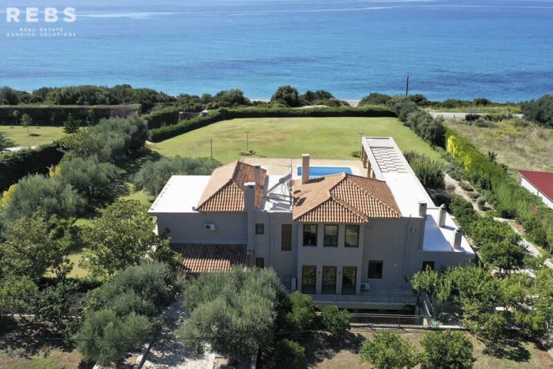 Preveza: Luxury seaside villa of 700 sqm for sale, built next to the largest beach on the west coast of Greece in the Ionian Sea. The villa contains a large garden with a swimming pool, centuries-old olive trees, fruit trees, vines and lush vegetation on a plot of 13 acres. The impressive landscape and natural beauty of the villa make it a unique property in the area. The villa is built to high design standards, based on comfort and traditional Greek design. It ensures maximum privacy since there are perimeter trees and manicured gardens, while enjoying the wonderful sea view from every corner of the property. The swimming pool is in front of the villa and is surrounded by well kept lawned gardens. On one side, a covered area runs the length of the pool ensuring you have the choice of sun or shade throughout the day. Swimming in the pool is a wonderful combination of the green of the garden and the bright blue of the Ionian Sea. The pool area is equipped with sunbeds and outdoor showers. You can spend relaxed afternoons enjoying the sun, the sea view and absolute tranquility. The villa has been carefully designed as a spacious and comfortable residence, so that its occupants feel refreshed by its light and airy design. It also has large sliding doors that run the entire length of the property, so that it is sunny and has views from every area of both the garden and the pool, as well as the sea. The large living room contains a fireplace and has comfortable sofas, TV, sound system and a large dining table. There are couches and armchairs scattered throughout the property for ultimate enjoyment and relaxation. The modern kitchen sits between the formal dining room and the indoor breakfast room, which leads directly to the covered outdoor dining area. The kitchen is fully equipped with everything a cozy home needs plus there is an indoor barbecue and a traditional wood oven. The impressive Master Suite has a large living room with comfortable sofas, a king size bed and a private balcony with outdoor furniture to relax and enjoy the amazing sea and sunset views. The Master Suite has an Italian tiled en-suite bathroom with a soaking tub and Jacuzzi shower system. The Family Suite with king size bed and comfortable sofa has a room with two single beds and a shared private bathroom with shower. All rooms in the Family Suite have a private balcony with sea view. Two double suites are located on the ground floor with king size beds, private bathrooms, comfortable sofas and large sliding doors leading to the garden and pool. The sixth bedroom with large double bed and en-suite bathroom is accessed via a games room. The games room is fully equipped with table tennis, flat screen TV, Dvd player and a lounge with comfortable seating and a table ideal for board games. The villa is located next to the sea. Opposite the main entrance there is a private path with 5 steps that leads you directly to a wonderful sandy beach and crystal clear sea. The beach is not organized and remains unexplored even at the peak of the season. It is ideal for windsurfing, kite surfing, fishing or just for swimming and sunbathing. The villa is located at a distance of approximately 20 km from the city of Preveza and 23 km from the airport of Aktion. While Ioannina, Parga, Lefkada and Sivota are at a distance of about half an hour by car. The villa is ideal both for a permanent or holiday home, as well as for investment.