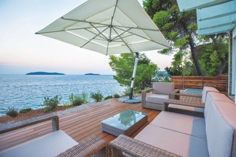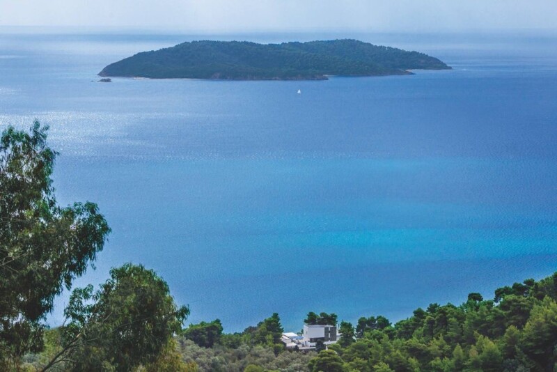 VerdeBlue is a luxury sea-front villa located on the renowned Greek island of Skiathos, Northwest of the Aegean Sea. It is set in one of the most prestigious spots of Skiathos that has been awarded with the “Blue Flag” award for its beautiful Mikros Vasilias beach. The property is entirely engulfed in pines trees, olives and luscious oak trees with a panoramic view of the Aegean pelages. VerdeBlue is well renowned for its plethora of amenities. It’s grand infinity pool offers spectacular unobstructed views of the Aegean Sea while multiple outdoor lounges invite for warm conversations and late night star gazing. The house doesn’t shy from its opulent design, an elevator that transport guests to all three floors and a wine cellar at the ground floor. An indoor fitness centre, spa and massage room also adorn the premise for those seeking to be relieved from their pompous daily routines and a pool bar to south body and soul afterwards. Built with the highest standards of luxury living, VerdeBlue encompasses modern technology, comfort and high-level security along with energy efficiency all year round. The Main residence consists of three levels, the top floor boasting its main veranda, complete with a 5 seat Jacuzzi spa and endless panoramic views of the ocean. On the lower floors there are four fully furnished independent apartments, each accommodating large outdoor seating areas. There are several master bedrooms with en suite bathrooms in the entire complex along with guest houses to accommodate further stay-ins. Its sleek minimalistic design along with its spacious interior and large terraces on all three levels adhere for its renowned reputation on the island.