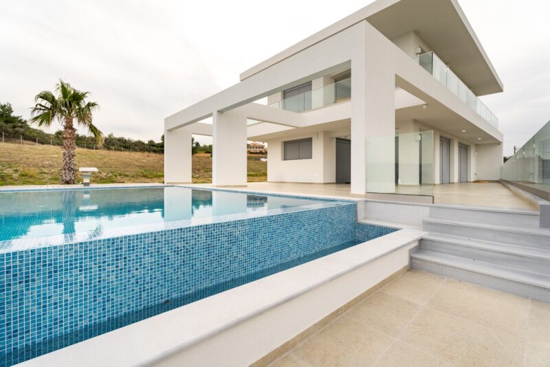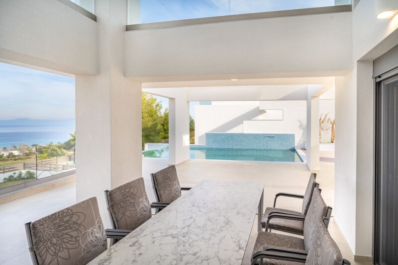 As you approach this stunning villa in Chanioti, Chalkidiki, you'll immediately be struck by the sleek, minimalist design that perfectly blends with the Mediterranean landscape. The 3000 sqm plot provides ample space for outdoor living, with a gorgeous infinity pool measuring 45 sqm that seems to merge seamlessly with the turquoise waters of the Toronaios Gulf. Spread over three levels, this spacious 250 sqm villa is perfect for families or groups of friends seeking privacy and comfort. The ground floor, which can also function as a separate apartment, boasts a bright and airy living area with panoramic windows that offer breathtaking views of the surrounding natural beauty. A total of five bedrooms and four bathrooms can comfortably accommodate guests, while the house's modern amenities, including a state of the art smarthome system, ensure that it can be enjoyed all year round. Underfloor heating and Daikin air conditioning, along with the smarthome system, create the perfect conditions for relaxation, no matter what the weather is like outside. With a security door and alarm system that provide complete peace of mind, this villa has been designed with safety in mind. There are no dangerous edges or sharp corners to worry about thanks to childproofing measures. The villa also has a guest room and parking bays that can hold up to four cars for those who enjoy hosting parties. Don't miss out on the opportunity to own this magnificent villa in Chanioti, Chalkidiki. Get in touch today to schedule a viewing and experience the luxury and serenity that this property has to offer. The Energy Performance Certificate is currently being issued. Kassandra is the westernmost peninsula of the Halkidiki trident, close to the Metropolitan Center of Thessaloniki. Unique Features: Kassandra provides its guests with everything they need for an unforgettable vacation. Beaches that satisfy your most demanding expectations, forests that beg to be explored, archaeological sites that take you on a journey to a majestic past and local products of high culinary value. Accessibility: Kassandra is located at a distance of 80 km from the International Airport of Thessaloniki, with which it is connected via the national highway Thessaloniki - Halkidiki. Investment Opportunity: The area of Kassandra, due to its unique tourist character and the short distance from Thessaloniki International Airport, has been a top choice for real estate investments in recent years, both in the hospitality and residential sectors, attracting significant investments from Central Europe, the Middle East and the wider Balkan area.
