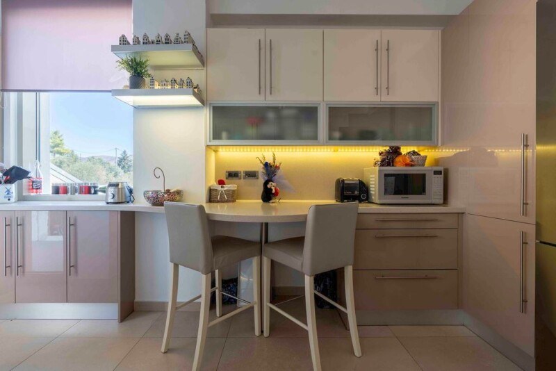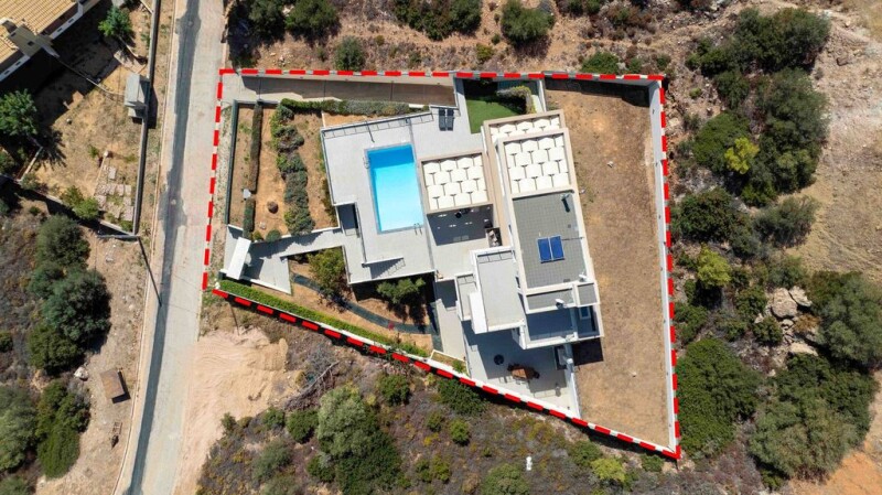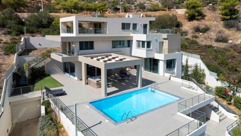 This exceptional 455 sq.m. single-family home, built in 2013 on a 1,325 sq.m. sloping plot, boasts a minimalistic aesthetic and unique character with unobstructed views. The main residence is spread over three levels, all serviced by a modern hydraulic elevator. The ground floor (128 sq.m.) features spacious, bright areas that include a large living room with an elegant fireplace, a dining area, and a WC. The independent kitchen, designed to high functionality standards, provides direct access to the outdoor area. The first floor (121 sq.m.) consists of 3 comfortable bedrooms with ample storage space, 2 spacious, modern bathrooms equipped with top-quality materials, and a laundry room. On the top floor, there is a spacious office, which can easily be converted into an additional bedroom, with direct access to a large terrace with a pergola and beautiful views. The basement, located at garden level, features an independent 85 sq.m. apartment, ideal for hosting guests or accommodating staff. This apartment includes 2 master bedrooms, a comfortable living area, and a fully equipped kitchen. On the same level, there is a large garage with 4 parking spaces, 4 storage rooms, and a gym. The outdoor space, with its BBQ area, carefully designed garden, and large 40 sq.m. swimming pool, is a true paradise, offering unforgettable moments of relaxation. This home stands out for its refined aesthetics and the use of high-quality materials throughout. Features include wooden floors, heavy-duty frames with bulletproof windows on the ground floor, modern security systems, a power generator, external thermal insulation, underfloor heating with zone control, and a central VRV air conditioning system. *The Energy Performance Certificate is currently being issued.