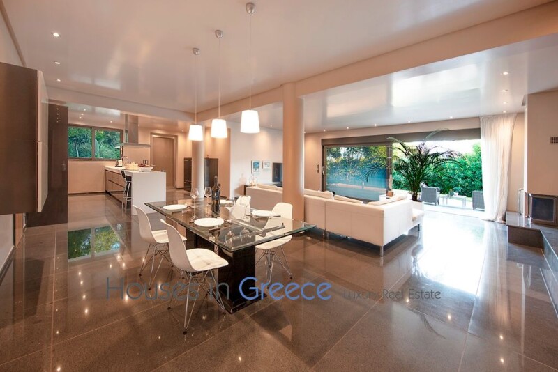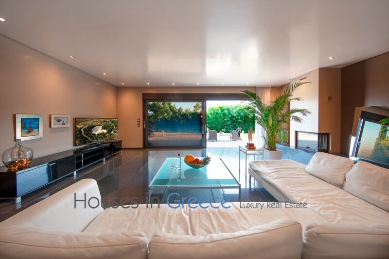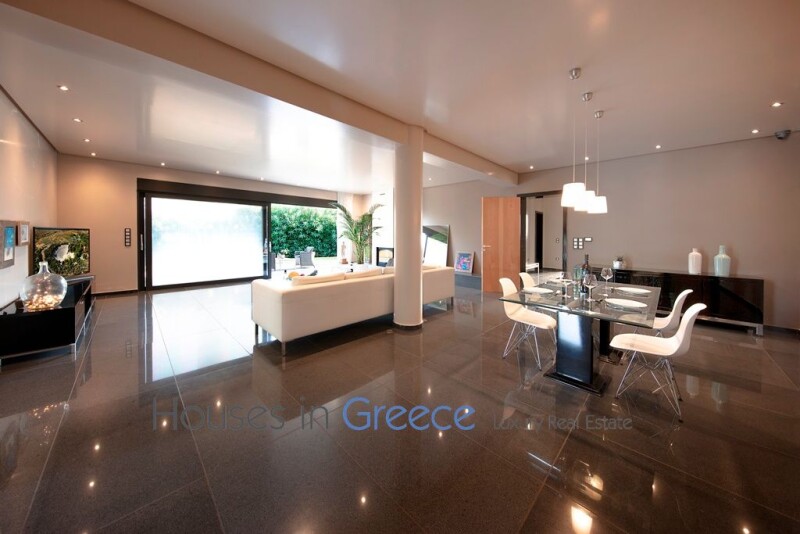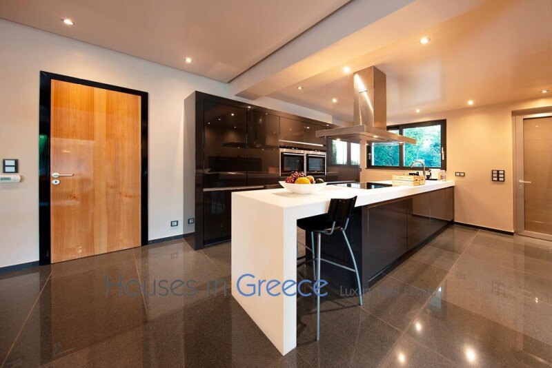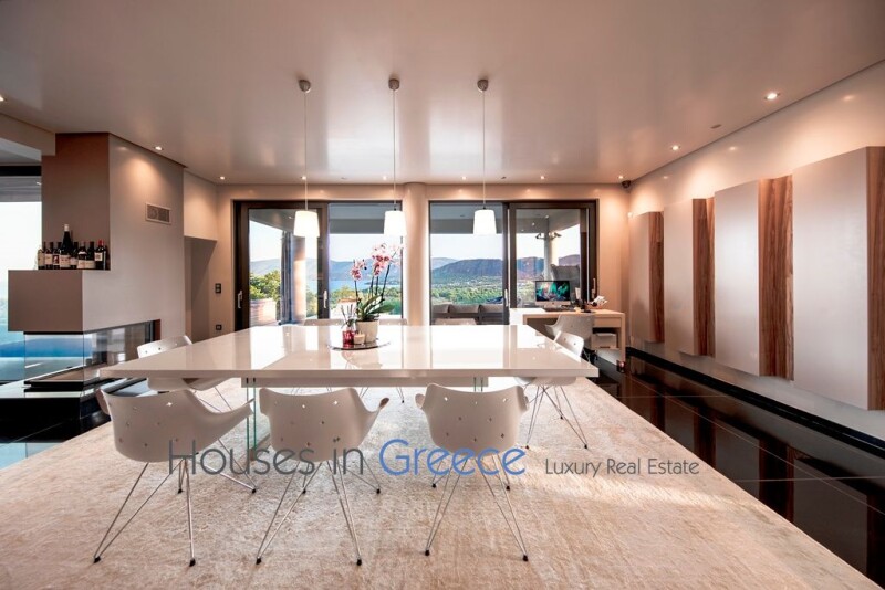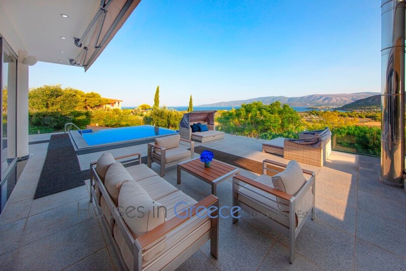 In Kerchies, close to Loutraki and Corinth and only 100km from Athens airport lies this fantastic luxurious villa. We have a total of 605 m2 set on 3 floors: The first and second floor (270m2) feature a spacious living- and dining room with open space kitchen of 154m2, 3 bedrooms with en-suite bathrooms and a terrace of 160 m2 with a private pool. The sea views are overwhelming, not only from the terrace but also as you enter into the living room. On the ground floor we have a guest apartment of 145 m2 with 2 bedrooms, 1 bathroom, 1 WC and a living room with open space kitchen and direct access to the gardens. We have storage space and parking/garage. No expenses have been spared to build this luxury villa: Floors, balconies and roof are of gray-black granite, double glazed windows of German quality, interior doors of olive wood, kitchen appliances from Gaggenau & Siemens, balcony and stair protections of thick glass, floor heating and cooling, geothermal hot water... A solar system produces 30,000 kw hours/year. The gardens around have 100-600 year old olive trees. The watering of the green lawn and the Mediterranean herbs is automatic and with the water of the plot. Another plus is the fact that the neighboring plots can not be build - the panoramic sea view and the privacy are guaranteed.