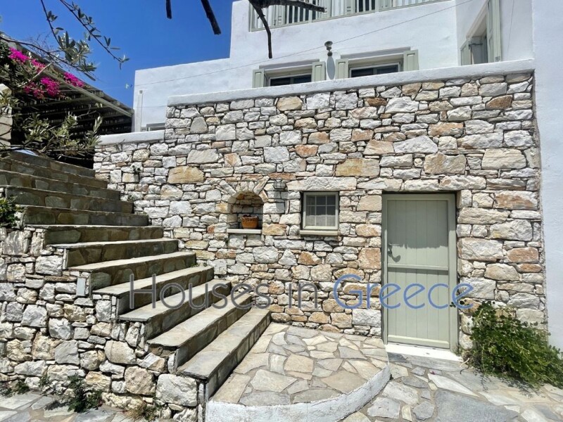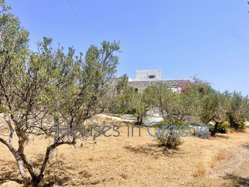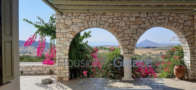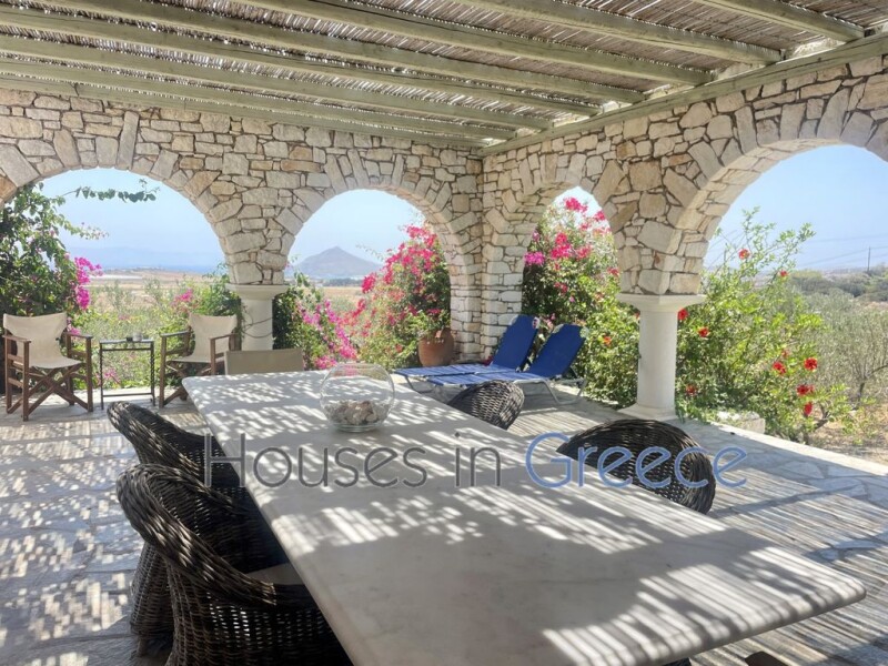 A country house with garden, traditional character and ideal location! Just 2 km from Naoussa, the house has a total surface area of 239 m² on a 2,500 m² plot planted with magnificent olive trees. It is built on two levels, with a large raised paved terrace with beautiful Cycladic arches and sea views. The large dining room under the shady pergola and bougainvillea is the place to meet and relax at any time of day. Inside the house, you are greeted by an open-plan kitchen with dining area, followed by the living room with fireplace and staircase, a jewel of the house. There is then a bathroom and three bedrooms, one of which has its own bathroom. The bedrooms have windows facing north and east. The third bedroom opens onto a charming little courtyard that also connects to the back door of the kitchen. Upstairs, the fourth bedroom is a master suite with a large terrace, balcony and lovely views of the sea and surrounding countryside. The building also includes a fifth small bedroom and bathroom on the ground floor of the house - as well as a large enclosed garage with plenty of storage space available.