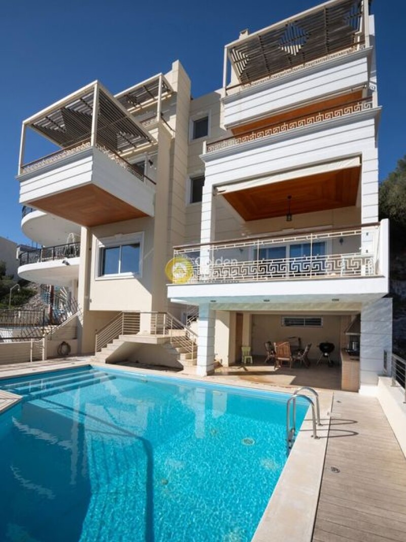 Excellent detached house of 450 sq.m. with luxurious materials, 3 levels, 4 bathrooms, wc, built in 2006, unlimited sea and mountain views, large covered terraces with California marbles, oil autonomy, central cooling system, solar system, generator, internal elevator on all levels, second elevator that connects the outer door with the main entrance of the house, food elevator that connects the kitchen with the dining room, built-in Bosch kitchen appliances, microwave oven, alarm system, intercom on all levels, internal communication system, VIMAR sockets. The first floor consists of a master bedroom with balcony, fireplace, bathroom with hydromassage, walking closet, two bedrooms, bathroom.The ground floor consists of living room, office area, dining room and wc. The lower floor consists of living room, fireplace, kitchen, guest room with walking closet, maid's room with bathroom, food and wine storage, playroom, laundry room. Outdoor area with illuminated swimming pool with bbq and electric oven, bathroom with shower, storage room 45 sq.m.