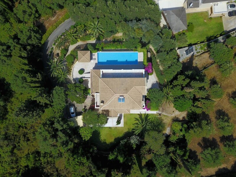 This newly-built, neo-classical style villa benefits from its prime position in the village of Kontokali, just 8 km. north of Corfu town. The property has been finished to the highest standards by its French architect/owner, and offers a once-in-a-lifetime opportunity to acquire an elegant island villa, built in perfect harmony with its surroundings. Consisting of 630 sq.m. of living area, the estate is entered via a large covered porch, supported by graceful Greek columns. Paying homage to the classical architecture of ancient times, the property has been sensitively designed and built with refined materials such as Greek marble. The villa is laid out over three levels, with the centrepiece surely being the impressively spacious living area of 250 sq.m., crowned with a chic mezzanine level and fringed with bay windows, allowing residents to take full advantage of the property’s amazing views across the Corfiot countryside and the Ionian Sea beyond. Upstairs are two master bedrooms measuring a comfortable 20 sq.m. each, both with en-suite bathrooms and opening out onto large, 50 sq.m. solarium terraces with breathtaking views of the sea and mainland mountains. The villa also boasts a state-of-the-art fitness room, guest WC and stylish dressing room. In addition, this gracious estate includes an independent guest apartment of 85 sq.m., containing two bedrooms,a bathroom, a separate WC anda fitted kitchen/ dining room. An additional 6,400 sq.m. of landscaped gardens filled with mature olive and fruit trees also reveals a stunning infinity pool with a gazebo and patio area, perfect for summertime barbecues and entertaining. Oenophiles take note – this impressive villa boasts an exclusive underground cave (25 sq.m.), ideal to be used as a wine cellar!.