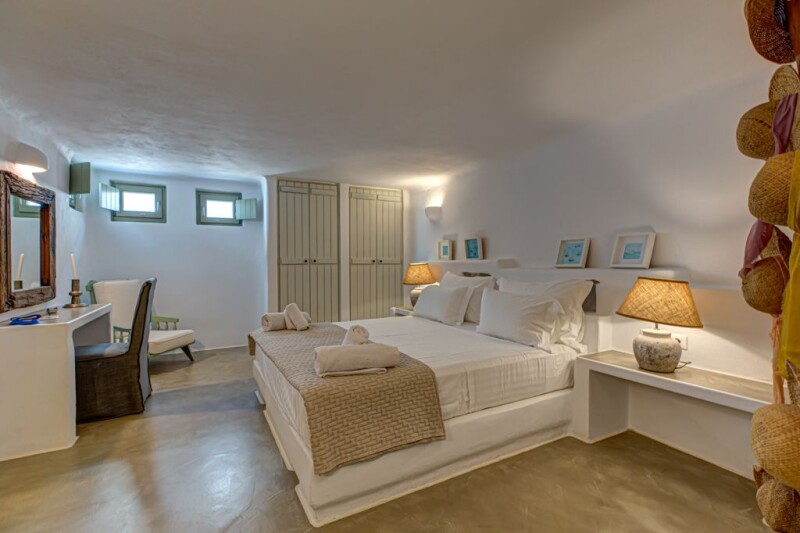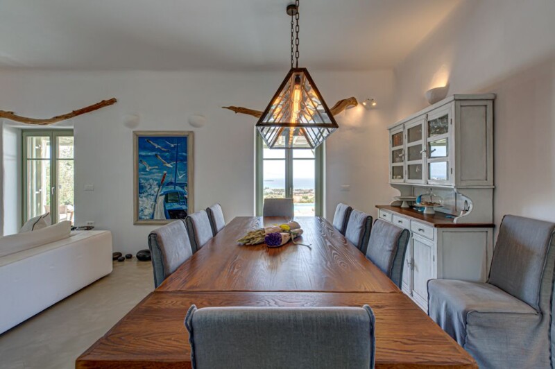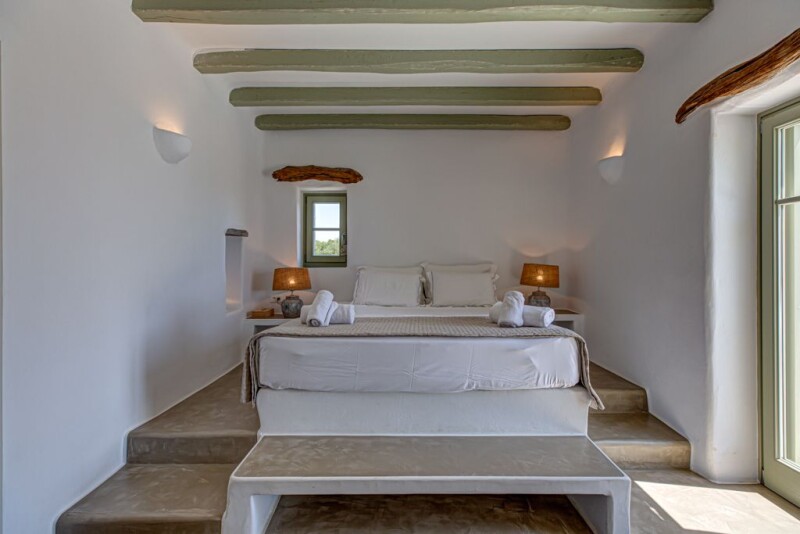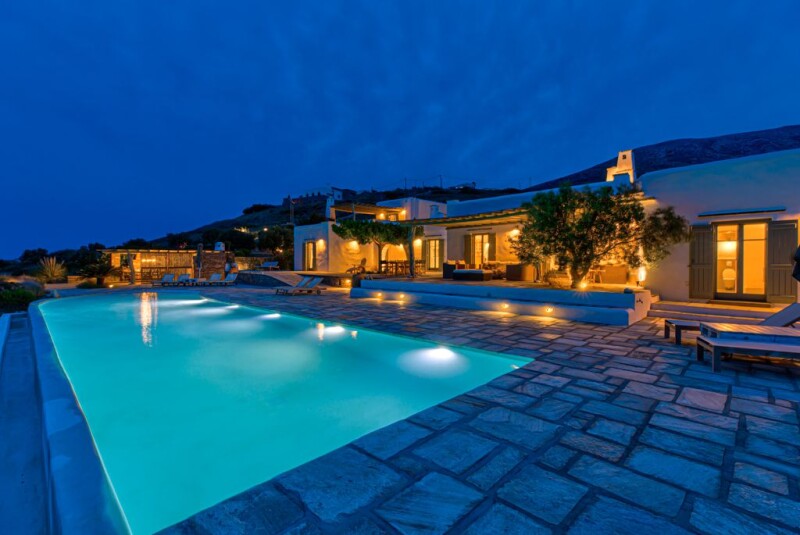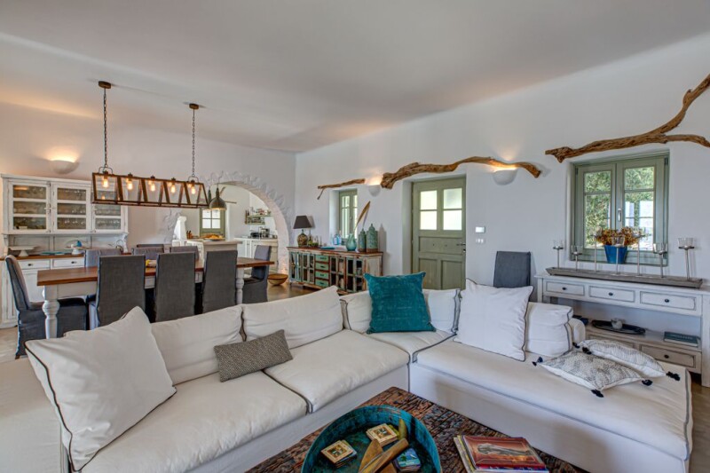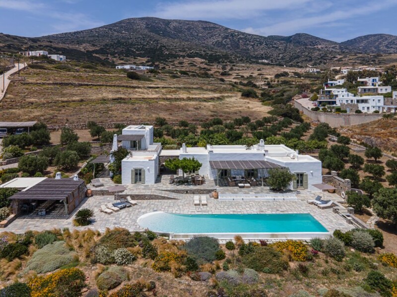 This striking seven bedroom villa in Tzane, was designed to create a residence of 336 m2 in a 6000 m2 plot surrounded by a discrete, well-groomed garden in which the greenery wrap around the house offers plenty of lounging spots with seclusion, tranquility and unobstructed views of the Aegean sea. Added bonus: a disabled friendly home! A beautiful world of local flora unravels before your eyes, making you feel that civilization is faraway, although you are only a few minutes away from Marpissa and Drios and some of its top beaches. The interior is bright and airy, dressed in white and grey tones and decorated in an unpretentious country-chic style. The ornamentation is kept to the level that allows the views to take centre stage. This smart home, has three sections: the main house with three separate bedrooms, two of them master with en-suite bathrooms, one three beds children’s room (catacomb type), open space kitchen, dining room & living room with a fireplace and another bathroom. Separate home cinema/ TV room, a private 76,13 m2 pool especially designed to be accessible for senior oriented and disable people and private gated car park. The second section is connected to the main house through protected passage to the disable people section: widened doorways, two assigned bedrooms, wheelchair-friendly bathroom, translates into enjoyfull vacation for everybody. The third section includes on the ground floor a well designed room for the service and on the first floor, the extra independent master bedroom with en-suite bathroom and independent terrace. This is a top class accommodation villa.