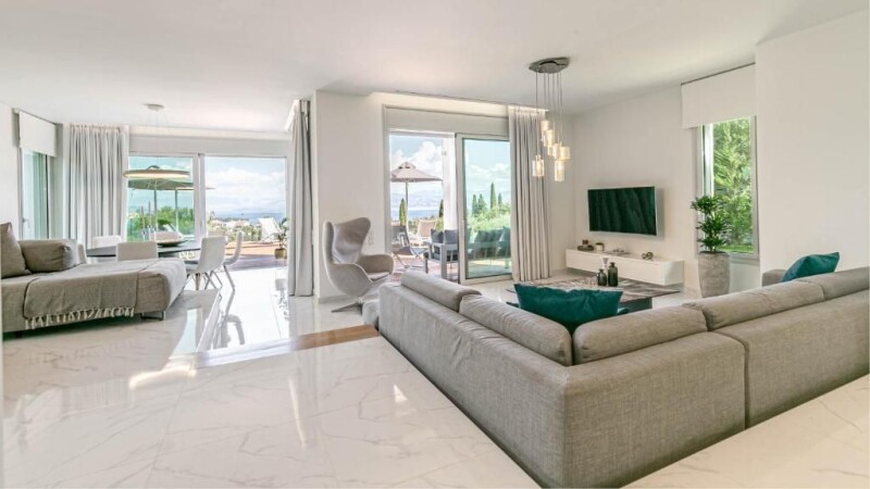 EVROPOULI KERKYRA for sale luxury Villa 400 sq.m. on a plot of 1,800 sq.m. with a panoramic and unlimited sea view of the Gulf of Corfu, the mainland coast and the fortresses of the city of Corfu. The villa is built in 2020 and fully equipped and furnished with beautiful and modern colors. It has 3 levels and consists of: Ground floor which includes a very spacious room that includes a large living room, a sitting room, a kitchen and a bathroom. On the first level, the villa offers a master bedroom (with bathroom), and a further two bedrooms (with shared bathroom) with stunning sea views. In addition, the lower level, next to the garden, has a large living room, a fully equipped kitchen, a bedroom and a bathroom. Outside there are large terraces overlooking the sea, a large garden with a private pool, a barbeque area and a comfortable parking space. It is recommended as a summer residence, but also as an investment property. SALE PRICE: 1,700,000 EUROS PROPERTY CODE: P-1432.