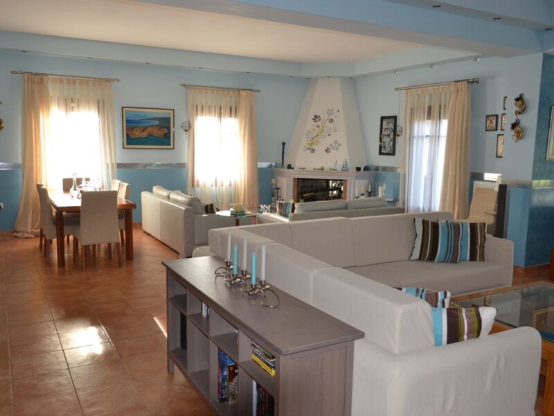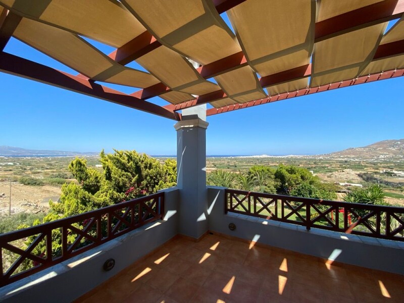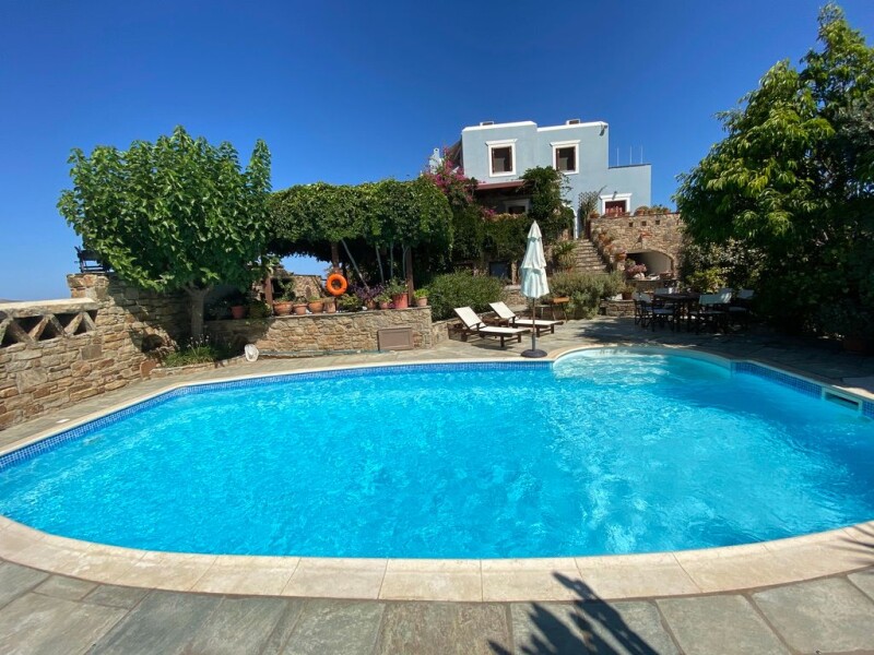 In Naxos, near the village of Glinado, spacious family holiday home for sale, set in a garden of 1,500 m2, planted with olive and fruit trees. The panorama offers a breathtaking view of the Aegean Sea, Paros, the sunset and the town of Naxos. The villa is distributed over 3 floors and has a total area of 540 m2. On the main level is a master bedroom with air conditioning, a bathroom, two living rooms, a dining room, as well as a fully equipped kitchen and a large balcony. On the upper level there are 4 main bedrooms with A / C and 3 balconies, 1 bathroom with shower, 1 large bathroom with shower and hydro massage tub for 2 people. On the ground floor there is a fitness room plus 1 small apartment with kitchen, 2 bedrooms, 1 bathroom and a living room. You can relax by the swimming pool, set in a pretty garden which also has a barbecue area. Its outdoor spaces are designed to provide a space for relaxation or fun, for any occasion and are equipped with a lighting system that creates a very romantic atmosphere at night. The superb architecture of the villa harmoniously combines natural beauty with elegance and the feeling of relaxation while providing some privacy. It is also possible to divide it into separate apartments.