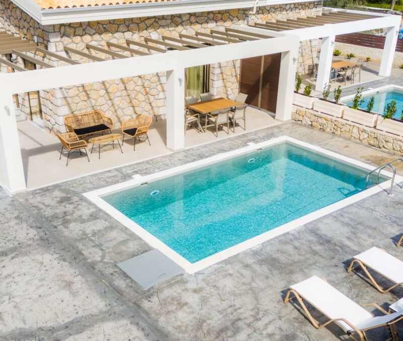 NYDRI LEFKADA 4 luxury villas of 400 sq.m. (100 sq.m. each), fully furnished, built in 2022, on a plot of 2,000 sq.m. and at a distance of 300m. from the sea. The villas are modern with very good construction materials and consist of 2 bedrooms, 2 bathrooms and a minimal living room joined by a modern stylish fully equipped kitchen where it connects directly to the dining terrace overlooking the pool. In the outdoor area there is an imposing swimming pool surrounded by spacious sunny terraces with dining area, a green lawn and parking area. They are ideal for permanent country homes, but also as investment properties in the cosmopolitan Nydri of Lefkada. SALE PRICE: 4,000,000 EUROS PROPERTY CODE: P-60.