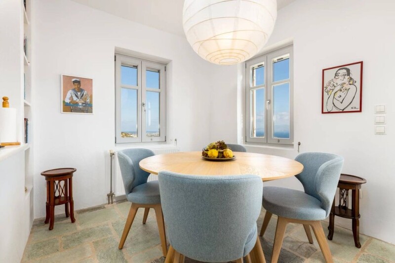 Located in Kostos, facing the island of Naxos, with a sublime panoramic sea view, this property consists of a villa, a house and a studio on a large wooded and natural plot of almost 6000sqm. Out of sight without being isolated, a dirt road leads to the property. The 130sqm single storey villa is made up of a large living room with fitted kitchen, dining room and living room with fireplace. all the windows open onto a large terrace with panoramic sea views. Three double bedrooms, three shower rooms / wc and a small office. The 82sqm house is on two floors. On the ground floor an open living room with fitted kitchen, dining and living area, a bedroom and a shower room / wc. Upstairs, a bedroom, a bedroom and a shower room / wc. The bedrooms have access to beautiful terraces with sea view. The 25sqm studio is composed of a kitchen area, bedroom and a shower room / wc, with two pretty terraces. Built in a traditional Cycladic architectural style, this property has all modern comforts with air conditioning and central heating. The floors are stone in the living areas and wooden floors in the bedrooms. A closed garage and outdoor parking. Energy certificate pending.