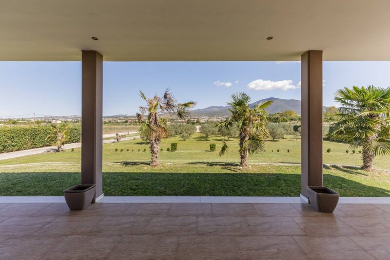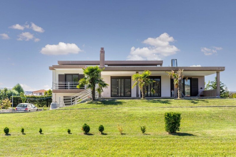 In one of the quietest suburbs of Thessaloniki with quick access to Macedonia airport and to Halkidiki, this unique villa is located. Designed with the highest construction standards but also with innovative energy design, it is an ideal proposal for quality and luxurious living. The villa extends to 480m2 in total, divided into two residences of 240m2 each, with the possibility of complete autonomy from each other, smart home design and low energy consumption.The one building, which is the main residence, consists of an open place space that houses the living room, the dining room and the modern kitchen and a separate guest WC. In the extension of the living room there is a 70m terrace with underfloor heating and a view of the garden palm trees i. A few steps lead us from the level of the living room to the level of 3 bedrooms, one bathroom and the master bedroom with ensuite bathroom and walk in closet.The second building, also 240m, houses the living room, the dining room and the kitchen in an open plan space, as well as 2 bedrooms, 1 bathroom, 1 playroom, 1 room for electrical installations, 1 laundry room and a huge warehouse. In both buildings there is a pre-installation of alarm and smoke detectors.The surrounding area of 5 acres is home to 50 olive trees and provides the possibility for the construction of a heated swimming pool with self-irrigation as well as tennis or basketball courts at the owner's option. The entire garden is served by an automatic watering system.5 solar panels are installed on the roof of the building for 70% savings in energy consumption, compared to a conventional house. * The Energy Performance Certificate is currently being issued. Nea Raidestos is located in the south-eastern part of Thessaloniki, about 15 km from the center. This beautiful suburb is now one of the most affluent areas of Thessaloniki that has developed significantly in recent years. The area consists of several newly built properties as well as condominium complexes. In the wider area, residents find within walking distance the Mediterranean Cosmos Mall, one of the largest shopping malls in the city offering a variety of choices to visitors. Also in the area are several private schools . In the Municipality of Nea Raidestos near Thermi is located the Thermi’s Dam which offers a breath of greenery to the residents highlighting the area as it has a rich natural environment and is ideal for short getaways outside the city. Another historical point of the area is the Baths of Thermi which are planned to be upgraded in the coming years through a project aimed at their development. In close proximity to Nea Raidestos, the National Road 16 and the Motorway 24 pass through Thermi, connecting Nea Raidestos with the rest of Thessaloniki. OASTH serves the area with two bus lines.