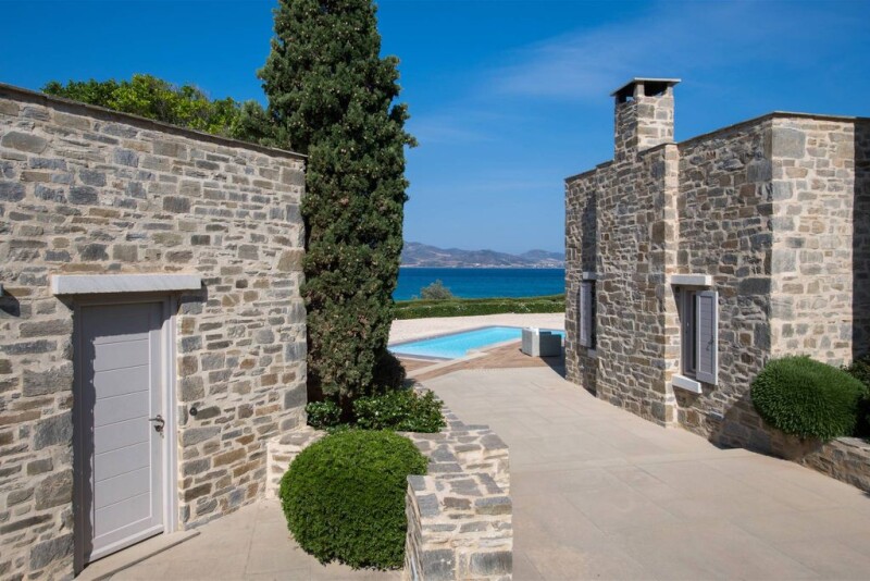 Whispers of the Sea is a marvellous waterfront stone-built villa on the island of Paros offering a mesmerizing sea panorama to Antiparos strait. Its minimalistic stone exterior is in contrast with the dominant white and blue of the Cycladic scenery and that feature makes its architecture and designs unique. Visiting Whispers of the Sea is a unique experience. One can enjoy the spacious and luxurious outdoor area surrounded by a Mediterranean garden of significant size. When you don’t feel like swimming in the pool explore the beautiful sandy beach just a few steps away. Its sunset views are absolutely spectacular. The property of 546 sq.m ( plus 258 sq.m auxiliary areas ) offers several types of accommodation and in several levels. You may choose among the main house, the independent guesthouse or the guest suite sleeping in a total of 12 guests. All offer clean lines and modern furnishings with warm colours as the owner has chosen neutral tones and wood as the dominant material. More than 130 olive trees produce yearly between 200 to 500 litres of premium organic olive oil while within the 3 acres garden there are 50 grapevines and a variety of fig trees and pomegranates. Two private irrigation wells cover the freshwater provision for the swimming pool and the garden.