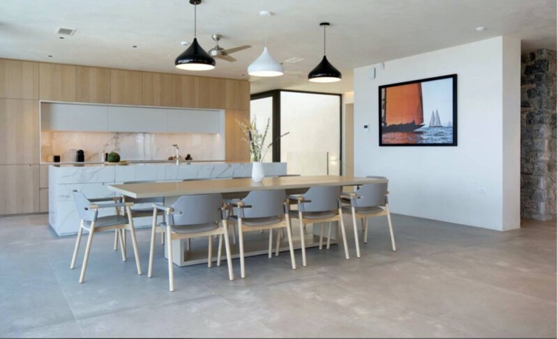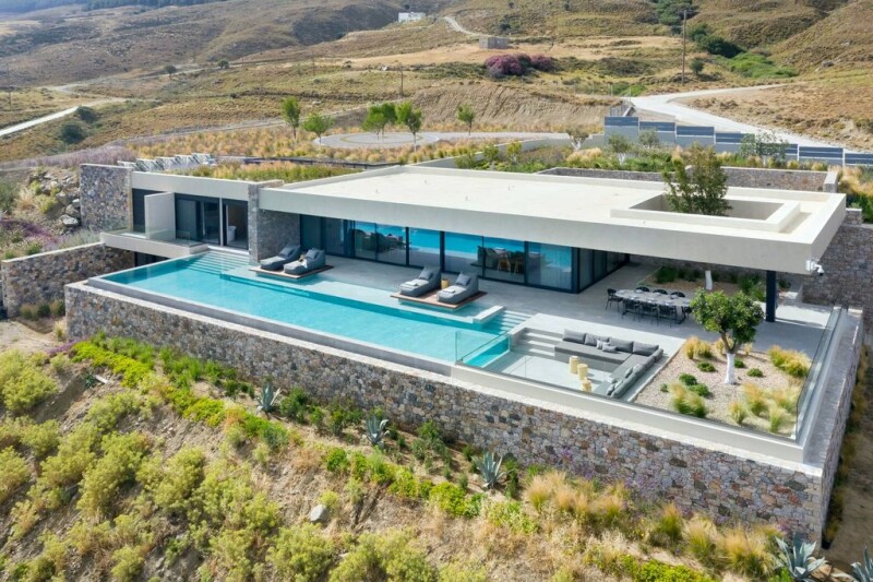 Nymphea, a wonderful two level villa on the island of Kos, with gorgeous, panoramic sea views from every room. Nymphea offers freedom, privacy and tranquility and blends in with the natural beauty of the surrounding landscape. On the lower level are two VIP bedrooms, restful havens decorated in cool tones to promote relaxation. Also on this level is a gym, sauna and massage room, all adding to the wellbeing offered by this stunning home. On the upper level the layout consists of a large open plan area incorporating the living room, dining room and ultra modern fully equipped kitchen. Floor to ceiling windows run the entire length of the room looking out over lovely views of the sea by day, which in the evening turn into a magical display of golden sunsets and twinkling lights. Mesmerising views to be enjoyed every hour of every day. The expansive patio windows lead out to beautifully considered and designed terraces with infinity swimming pool and large outdoor dining area. Two wooden platforms with seating hover just above the pool. Stone work creates a lovely look to the exterior and easily maintained ornamental planting makes for an attractive garden. Another VIP bedroom and one master suite are on the upper level all decorated in the same neutral tones that run throughout the entire property. Two special features at Nymphea are a secure room fitted with the latest technology and a helipad. There is also the benefit of a planning permission to build a second villa of 474sqm.