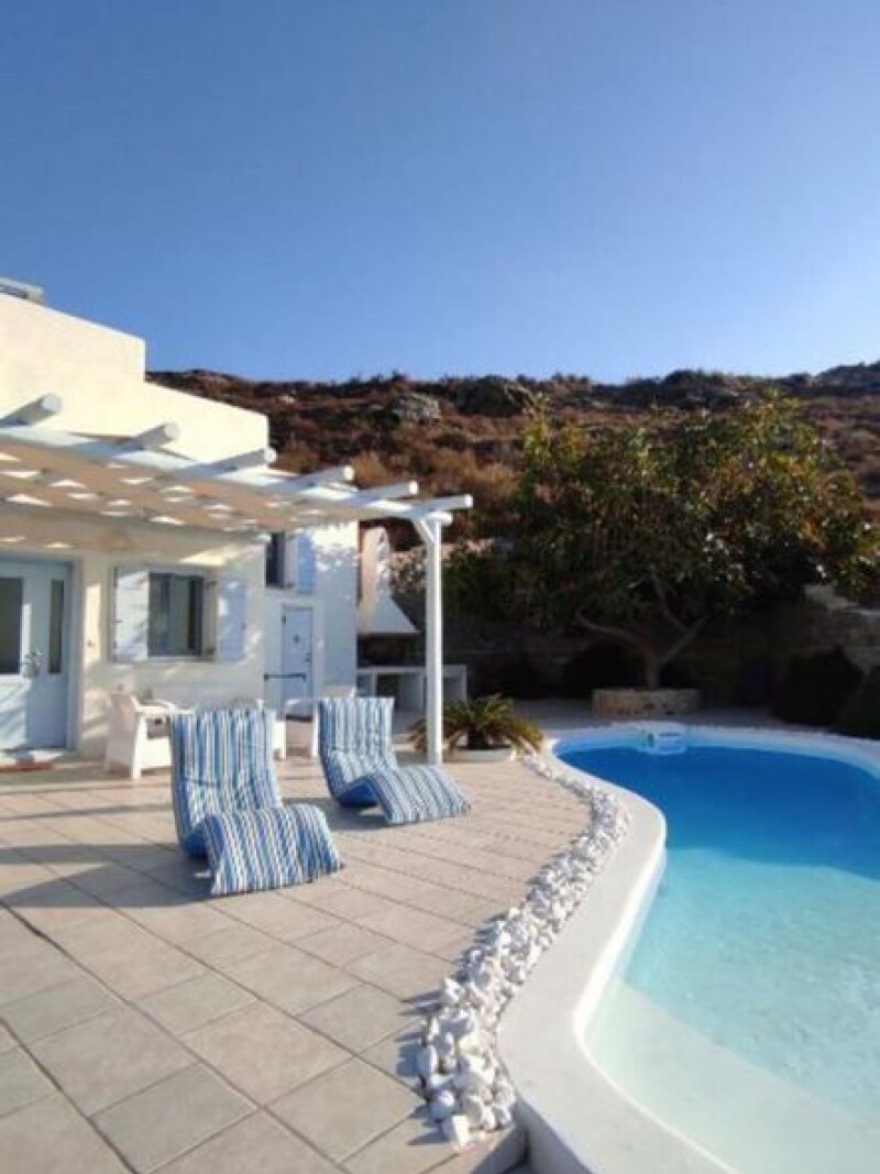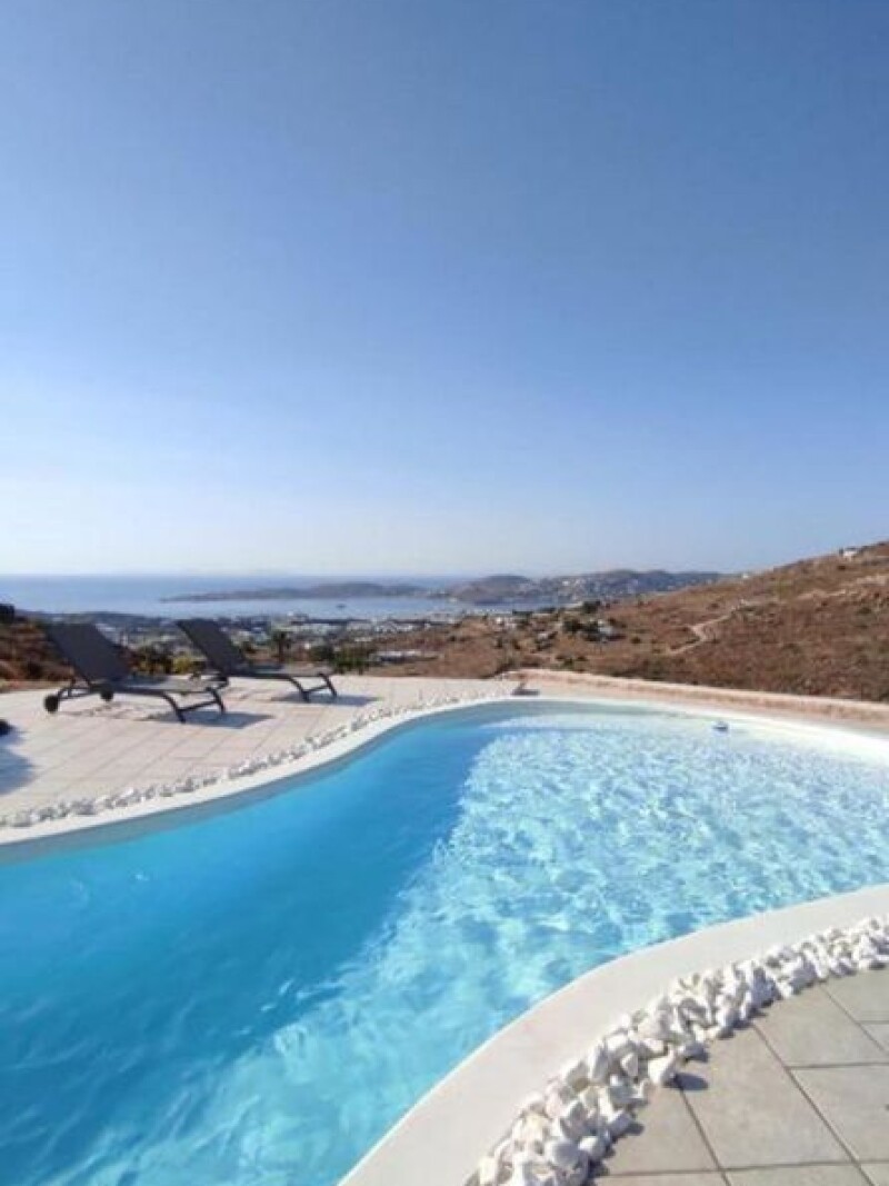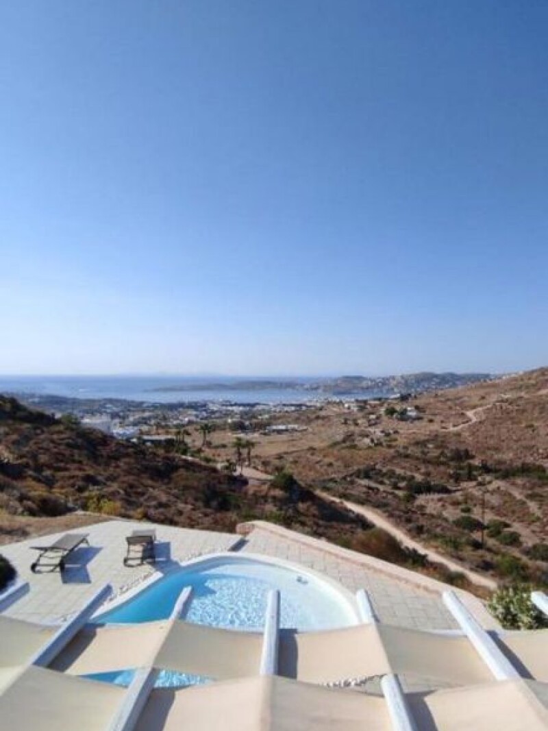 Perched on the scenic hill of Kakapetra in Parikia, just 2.8 km from the town center, this stunning villa offers breathtaking panoramic views of both the sea and the mountains. Designed for ultimate comfort and relaxation, this exquisite home seamlessly blends modern elegance with Cycladic charm. Key Features: - 2 master bedrooms with en-suite bathrooms - 1 guest WC - Spacious open-plan living area with a sunken kitchen and dining space - Spectacular sea, pool, and mountain views from every room - Large private swimming pool (11m x 4m) - Expansive outdoor spaces (600 sq.m), including a beautifully landscaped courtyard and pergola-covered lounge area - 2 outdoor parking spaces - External storage (2 sq.m.) Modern Comfort & Convenience: - Solar water heater - Air conditioning - Fully equipped kitchen with built-in appliances Move-in ready: available for immediate occupancy.