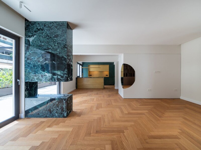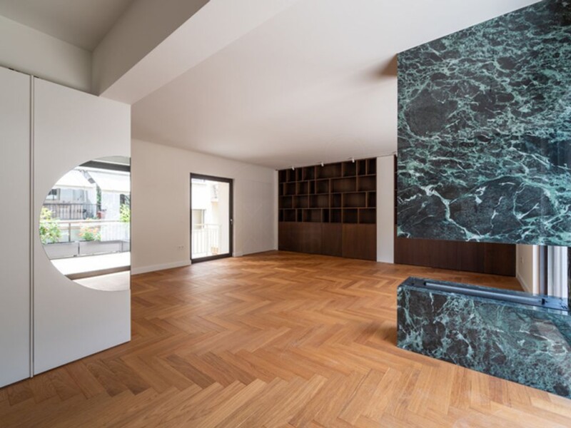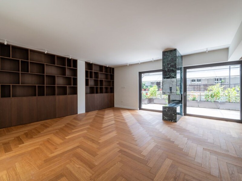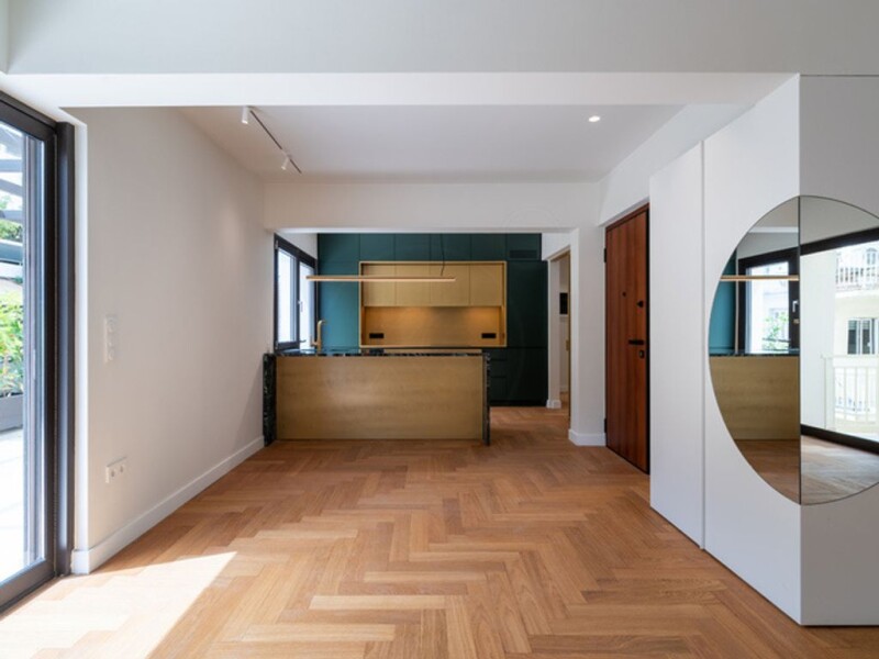 Fully renovated apartment of 102 sq.m. with a 45 sq.m. terrace, dual-aspect. Located 200 meters from the Hilton. It consists of two bedrooms, one bathroom, and two W.C. Situated on the 3rd floor and is a second penthouse. The kitchen is fully equipped with electrical appliances. It has autonomous heating with natural gas as well as underfloor heating throughout the space. The floors are made of solid oak. The renovation was completed in May 2024.