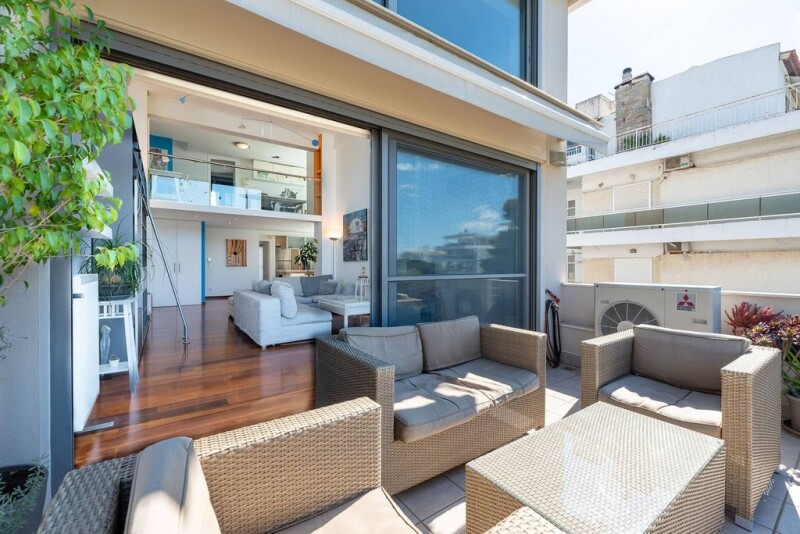 A unique penthouse maisonette, of special aesthetics, with panoramic sea views, in one of the most central points of Voula, opens its doors, offering its new owner, a special combination of comfort, luxury and functionality. The property is within walking distance from the market and restaurants and bars of both Voula and Glyfada and just 650 meters from the nearest beach. It covers a total area of 171 sq.m. and extends over three levels. On the level of the 3rd floor we find a comfortable and spacious living room with fireplace, dining room and open kitchen, while on the same level there are two bedrooms with a bathroom, as well as a small storage / laundry area, which can be converted into a guest wc, depending on the needs of the new owner. This level has a very high ceiling, with the whole high facade covered by windows, which makes the area very bright, giving a sense of open space and freedom, while it is also surrounded by spacious balconies. One level above, there is an open space of various use, as well as a master bedroom with its ensuite bathroom, while on the third and last level, we find a space that can also be used according to the needs of the buyer, which includes a small kitchen installation (kitchenette). Externally on this floor, we find a lovely terrace of approx. 110 sq.m., exclusive use of the apartment, which offers unique, unobstructed and panoramic views of the sea, mountain and urban fabric, ideal for events and family gatherings. The apartment is heated autonomously with natural gas, has air conditioning, aluminium frames, double glazing and wooden floors of excellent quality. 3 parking spaces of aprox. 56 sqm. are also included, in a spacious underground garage, and a 15 sq.m. basement storage. The elevator reaches the first level of the house externally, while it ends internally up to the third level. A unique maisonette, at a focal point, ideal for both home ownership and investment!.