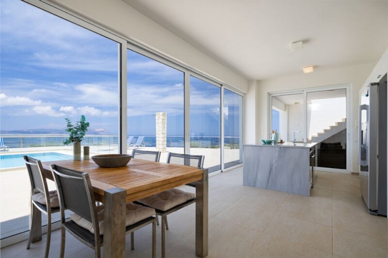 Magnificent modern villa of 250 m² is located on an elevated position next to the picturesque village of Kokkino Chorie. Built in 2008, this luxurious two-level villa consists of 3 bedrooms, 2 bathrooms, a spacious living room, a kitchen combined with a magnificent dining room, a large utility room and a garage. Due to the unique location of the building and the large French windows, the villa is always very bright and offers a bewitching sea view from every room. From all the rooms of the villa through panoramic windows-doors there is access to a large balcony or to the area in front of the pool. The villa is designed in a minimalist style. • When arranging the villa, only the highest quality materials and equipment were used. • The walls are painted in light colors, the floor is light beige non-slip tiles, bathrooms and toilets are lined with high-quality tiles, plumbing fixtures are installed (rain shower, corner bath, sinks, toilets) • Fitted household appliances (refrigerator, extractor hood, hob, oven, dishwasher, air conditioners, washing machine, microwave oven, blender, toaster, hair dryers (all well-known brands) • Kitchen island with marble slab • Stair and balcony railings inox • Built-in wardrobes in each bedroom • Aluminum windows (double glazing) provide excellent sound insulation • Insect screens, electric shutters • Solar water heating system • Swimming pool 35 m² • Lighting of the territory and the pool • Central gate with remote control • Palm alley leading to the villa • In front of the villa there is a 35 m² swimming pool with a sunbathing area and breathtaking sea views • A large area of the villa with an area of 4,220 m² is surrounded by a stone fence. FEATURES Air conditioning Asphalt drive Beach nearby Built in kitchen electrical appliances Double glazed windows and doors Electronic entrance gates Fitted bathrooms Large balcony Mountain view Outdoor shower Private swimming pool Sea view Solar water heating panel Sun terrace.