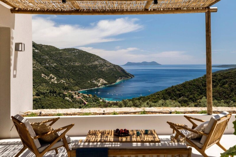 Situated on a verdant hillside near the charming village of Poros in southern Lefkas, this south-facing location offers a stunning setting for this four bedroom, two level home. The design and positioning of the villa were inspired by the southerly orientation and panoramic views. The 190 sqm house is thoughtfully arranged on multiple levels to harmonize with the natural incline of the site. The design team focused on creating a modern aesthetic that maximizes the views and extends the living experience outdoors. The ground floor features a clean, streamlined design with distinct geometric shapes that flow effortlessly together thanks to clever use of pergolas, patios, and open views. A striking cube-shaped addition sits on top, home to the luxurious master bedroom and its own private terrace. Natural materials like stone, wood, and water are used throughout, discreetly integrating the villa into the existing landscape. The main residence includes the master suite and a second bedroom, along with an open-plan living area that combines the kitchen, dining space, storage, and a guest bathroom. The primary entrance to the home is on the east side, accessed via a wide, plant-lined corridor that guides visitors from the parking area. An additional external staircase leads to a rear corridor, offering an alternative entrance directly to the master suite through its terrace. A 17-meter-long infinity pool enhances the connection to the surrounding water, framed by various outdoor spaces that offer different experiences. At the heart of the ground level, a shaded living area sheltered beneath a sleek overhang provides the perfect vantage point to take in the breathtaking views of Poros bay and the nearby islands. This central outdoor space serves as a hub, linking the different levels and sections of the home.