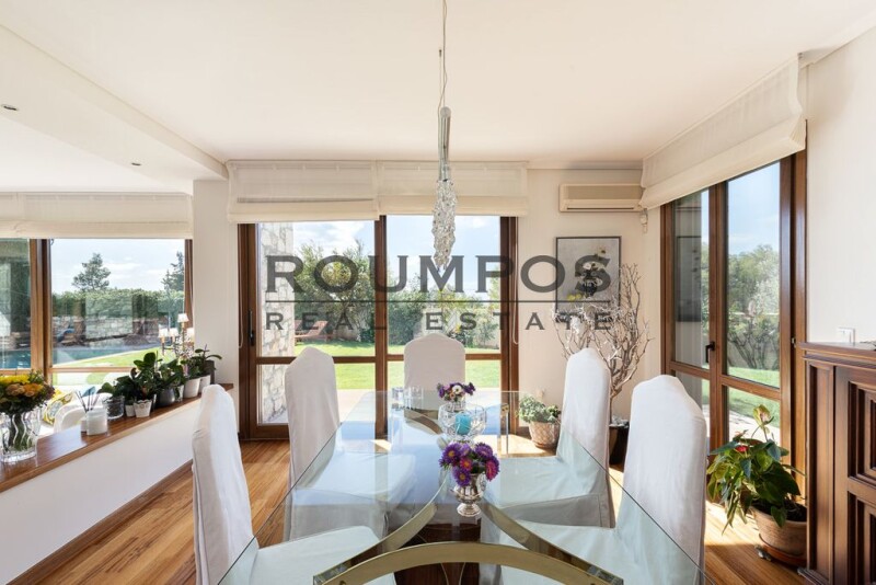 We present to you an exceptional detached house near the square of Old Penteli, in a quiet location with panoramic views that offer a true sense of tranquility and luxury. This residence stands out for its well-thought-out layout, providing comfort and functionality on every level. Spanning three levels plus an attic, it is designed as follows: On the ground floor, residents can enjoy two spacious living rooms with access to the lush garden. One of the living rooms features a fireplace, while the other is situated in a corner position, opening up to the pool and offering stunning views and natural light through large glass panels that surround it. The dining area connects directly to the kitchen, which is independent and fully equipped with modern appliances. At the entrance of the ground floor, there is also a master bedroom that can easily be transformed into an office space, and a comfortable guest WC, ideal for serving visitors. The first floor stands out for its warmth and elegance, making it ideal for relaxation as well as professional activities. The spacious living room, complemented by impressive floor-to-ceiling windows with panoramic views, offers abundant natural light and a unique sense of openness. The fireplace creates a welcoming atmosphere, perfect for cozy moments on chilly winter nights. Next to the living area, there is a modern and functional office space, designed to provide inspiration and tranquility for work, with easy access to both the view and natural light. On the same level, there are two cozy children's rooms, one of which features a small loft, offering additional space for play or storage. The first floor is completed by a comfortable bathroom and a spacious master bedroom, which includes its own walk-in closet and en-suite bathroom, providing ultimate comfort and privacy. The attic, measuring 40 sq.m., provides an open-plan space with a private bathroom, ideal for use as a guest room, additional bedroom, or a quiet workspace, enjoying peace and seclusion from the other levels. In the basement of the residence, there is a large storage room,laundry room and the boiler room, while the service room also has its own bathroom, efficiently serving the household staff. Additionally, there is a closed garage with a capacity for three parking spaces, providing absolute security and convenience. The exterior space is equally impressive, with a meticulously landscaped garden featuring automatic irrigation and a lush lawn, a 40 sq.m. swimming pool for moments of relaxation and entertainment, and a well-organized BBQ area, perfect for unforgettable gatherings with friends and family. The outdoor area is surrounded by trees and greenery, adding a unique sense of privacy and tranquility. Additional Features: 40 sq.m. swimming pool, BBQ, garden, lawn, and trees. Three parking spaces (all in an underground garage). Central heating with oil, air conditioning, boiler, and fireplace (2). High-quality wooden frames with double-glazed windows, insect screens, and premium Iroko wood flooring Elevator serving all levels except the attic, along with an internal staircase. Security door, intercom, alarm system, and security cameras. Playroom, jacuzzi, electric appliances, storage room, attic, nighttime electricity tariff, and satell This detached house, located in a quiet neighborhood in Penteli, combines comfort and high aesthetics, offering an ideal space for a family seeking quality living in a remarkable environment, close to all the city’s amenities and the tranquility of nature. Roumpos Real Estate.