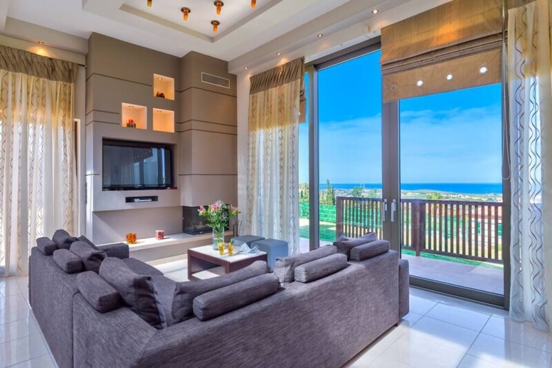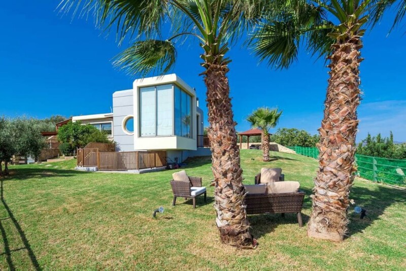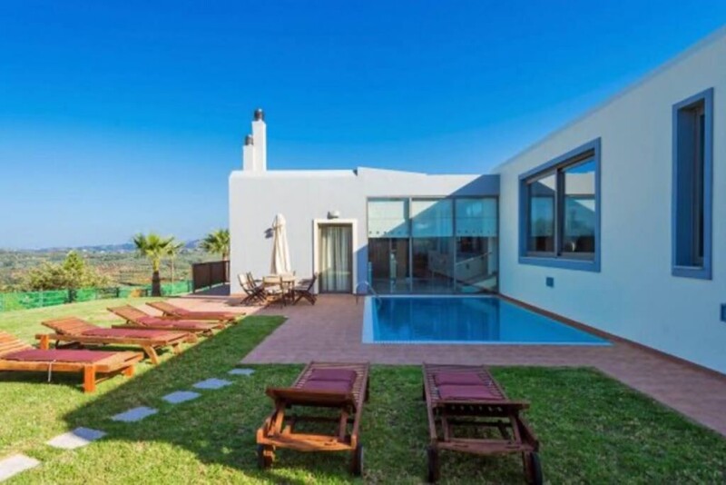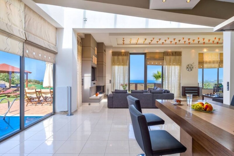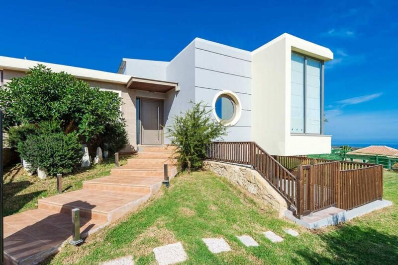 An elegant & luxury 5-bedroom villa nestled on the top of a hill, in the village of Maleme and Xamoudochori near Platanias resort, offering sublime and panoramic views over the azure sea and the Island of Theodorou, as also the hinterland and the mountains. You will definitely feel the aura of freshness and positivity! Platanias is only 10min drive, where there are lots of bars, minimarkets, clubs and all kind of shops. The property offers five separate bedrooms, including one master bedroom with en-suite bathroom. A private, heated swimming pool with sun loungers, an outdoor bar with fully equipped BBQ, a large courtyard with a lawn area, an outdoor pergola with sitting area, an enclosed children area and a private parking area are also included. A laser-technology security system is provided, whereas huge bullet-proof glass doors and windows are used throughout the property, offering spectacular vistas to the sea.