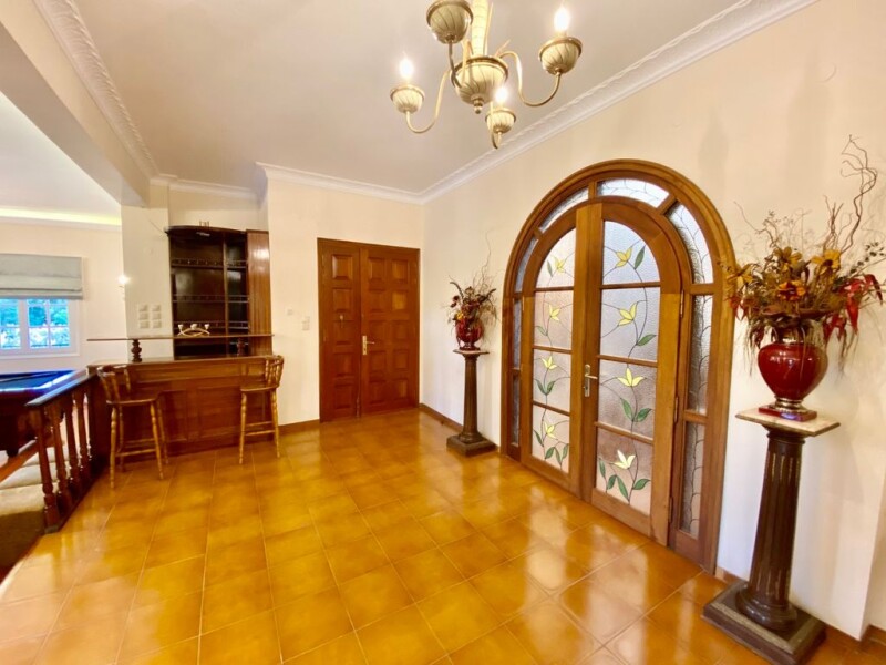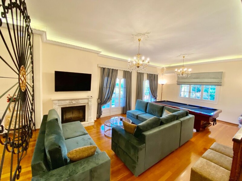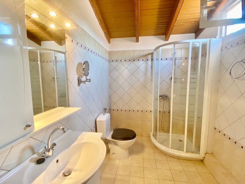 This is a spacious 457sq.m. villa situated in a lush green natural setting in Corfu. The villa combines modern aesthetics with natural surroundings, and is surrounded by well-tended gardens. The ground floor features a spacious open plan living room/dining room with a fireplace, a kitchen, one bedroom, and one bathroom with a shower. A handmade wooden staircase takes you to the first floor, which comprises of three bedrooms, one bathroom, and one master bedroom with en suite bathroom with a bathtub. All bedrooms have balconies with views of the garden and the surrounding scenery. The second floor is a 92sq.m. loft converted into two more bedrooms, one of which has an en suite bathroom with a shower. A large 110sq.m. basement completes the property, providing plenty of storage space. The villa sits on a large plot of 3,863 sq.m. and is surrounded by trees, lawn, flowers, a barbecue area, a playground, and a large swimming pool, which also includes a children's pool. It is sold furnished and benefits from central heating and air conditioning in every room. The villa is suitable for permanent residence, a holiday house, or investment, as it is situated in a quiet location and can accommodate up to 16 people. The villa is located 2.5km from the beach of Dassia and 10km from the well-known beach of Paleokastritsa with its crystal-clear water. Corfu town and the airport are approximately 12km away.