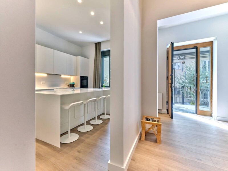 Imagine stepping into your own private sanctuary in the very heart of ancient Athens. This exceptional ground-floor apartment, situated within the historic Acropolis district, has an expansive 145sq.m layout, and invites you to experience the city’s vibrant energy while enveloped in comfort and refined elegance. Beyond the beautiful entrance, framed by stylish planting, discover a haven of modern design, recently refreshed by a complete renovation. Rich wooden floors flow throughout the open-plan living space, where built-in shelving and a dedicated workstation blend seamlessly with areas for relaxation. Fully furnished and impeccably renovated, this turnkey apartment is ideal for those seeking a stylish and effortless lifestyle just steps away from Athens most iconic landmarks. The sleek white kitchen, complete with a central island that doubles as a breakfast bar, features minimalist cabinetry with sleek, handle-less fronts for a clean and contemporary look. Both bedrooms feature feature built-in wardrobes, while the luxurious bathrooms showcase contrasting marble finishes. The apartment benefits from a private 18 sq.m garden, offering a sense of seclusion in the heart of Athens, and a versatile 15 square meter space that could easily be transformed into a charming guest room or a quiet home office.