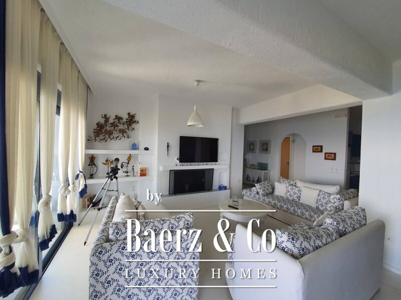 In Amoni and in a location with wonderful sea views, a luxurious house, following the Cycladic style, is available for sale. This is a house with a total sutface of approximately 350 sq.m. within an autonomous plot. It consists of three levels, which can become independent and communicate through an internal staircase. The first level is a purely autonomous level, which has a large and comfortable living room with a fireplace, a kitchen area and three bedrooms, each one with its own bathroom. On the same level, we also find a large and comfortable, covered terrace from where one can enjoy the wonderful view. On the second level, we find another apartment, which consists of a large living room with a fireplace, the main kitchen of the house, two bedrooms and a w.c. It is worth noting that from this point we have access to another large balcony with beautiful views and the outdoor-summer dining area, as well as the pool. The third and last level consists of a comfortable room with a bathroom. At the back of the house, there is a storage space of about 100 sq.m., which can be converted into another independent apartment. The property has a beautifully landscaped plot, which can be easily accessed by car. The outstanding features of the house include, apart from the quality of the construction, the beautiful view toward the Saronic Gulf, but also the natural beauty and the quiet ambiance of the area.