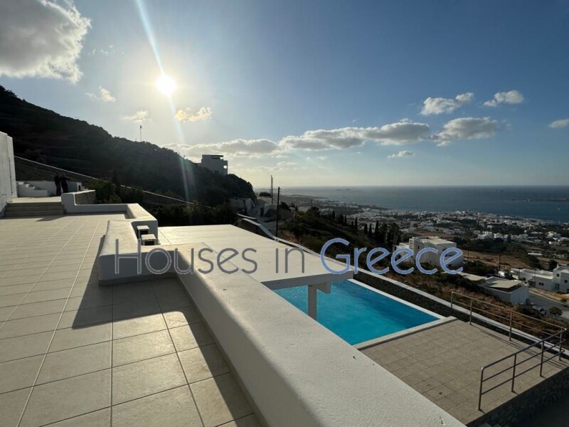 In Agioi Anargyroi, one of the most beautiful spots in Parikia, stands this luxurious 320 sq.m. villa on a 4,000 sq.m. plot. The views offered by this property are among the most stunning on the island, encompassing the bay of Parikia, the endless blue of the Aegean Sea, and breathtaking sunsets. The location combines tranquility and seclusion with close proximity to the beaches and the town center, making the house ideal for both permanent residence and holiday use. The building is two-story and features two separate residences. The ground floor measures 170 sq.m. and includes a living room, kitchen, three bedrooms—one of which is en suite—and a bathroom. It also has a large terrace and a 50 sq.m. pool. On the upper floor, there is a 150 sq.m. residence that features a living room, kitchen, and three bedrooms, one of which is also en suite, along with a bathroom. This level has a large terrace and an outdoor jacuzzi. The property boasts spacious areas, a modern layout, and meticulous architecture that harmonizes with the natural surroundings. This is a property that combines luxury, comfort, and unparalleled views in a location that truly stands out for its beauty and quality.
