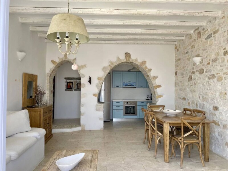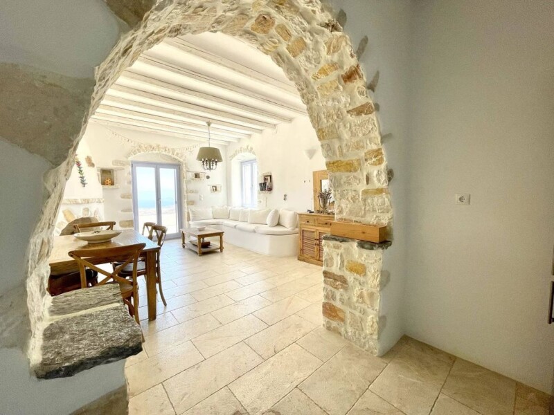 Located on the heights of Lefkes, the former capital of the island, this property offers a breathtaking and clear view on the sea and the island of Naxos. On a plot of 1100sqm, the entrance to the property is from the bottom of the land, through the parking. The house consists of two separate and independent dwellings each with a very large terrace with stunning sea views. The main house consists of a living room dining room- living room with fireplace, an open kitchen with back kitchen. The kitchen gives access to a rear terrace and the guest toilet. A corridor leads to 3 bedrooms and a shower room / wc. The independent apartment consists of a living room with kitchenette, a living room and two bedrooms and two shower room / wc. A technical room/storage space. The land is enclosed by stone walls. The whole house is equipped with electric heating and solar panels. All windows are equipped with mosquito nets. Energy certificate in progress.